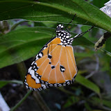 今天早上到校時,看見蛹殼已變透明,明顯可見翅膀的紋路,今天之內一定會出來,正巧瑞美老師派學生來叫我去看她的樺斑蝶,我去繞了一圈,回來想拍「破蛹之前,蛹的樣子」,沒想到,真的看到一個「破蛹」,裡面的樺斑蝶已經掛在葉子上了,沒有看到破蛹的瞬間,雖然有點可惜,不過小朋友還是擠成一團看著這隻新生的蝴蝶,多麼美麗的花紋和配色啊!