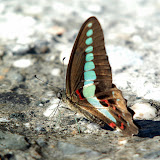 ↑ 青帶鳳蝶顧名思義其黑褐色翅膀的中央有一條連續的青帶,張開翅膀的寬度有5-6公分;在校園中常出現在有樟樹生長的地方,但它們飛行速度快,又喜歡在樹梢高飛,所以並不容易觀察。這幾張是和圳成老師去水源地游泳之後,發現牠在河邊溼地吸水時所拍攝,也只有在河邊等才比較容易觀察到牠美麗的身影。